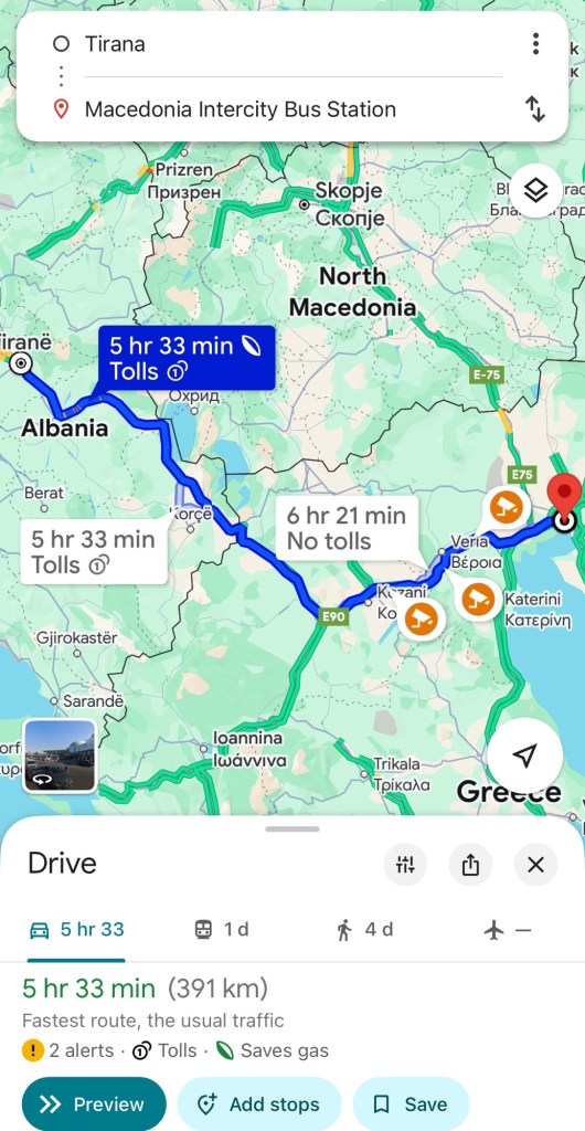 My journey began in Tirana, Albania. After checking out of the hostel at the unholy hour of 1:00 am, I hopped into a taxi bound for Tirana East Bus Terminal, spending 10 Euros. By 1:00 pm, I found myself in Thessaloniki, Greece, ready to embrace a new destination.